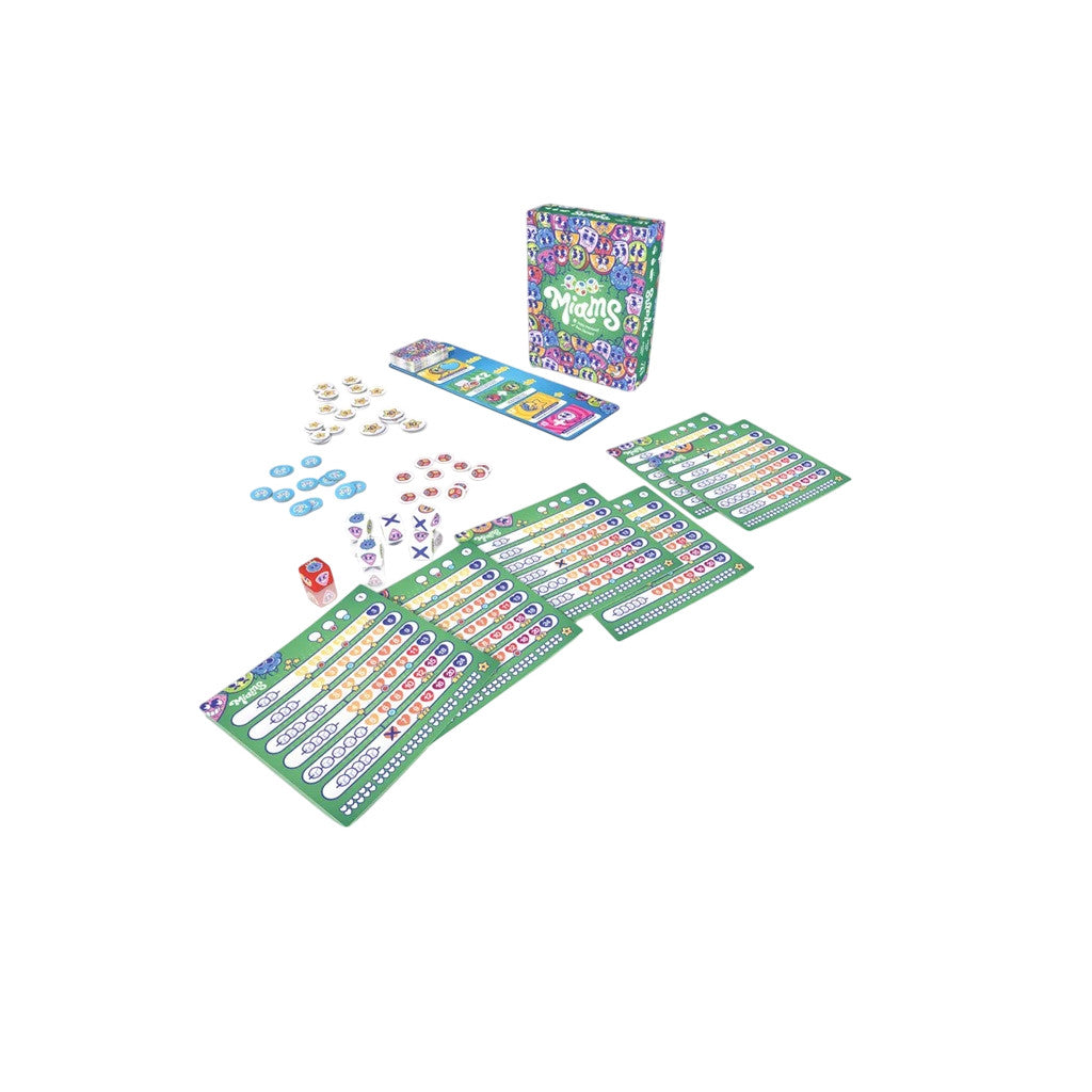 Miams est un jeu de dés survitaminé pour toute la famille dès 10 ans. Lancez vos dés, composez des combinaisons de fruits (paire, brelan, full, carré, suite ou miams), puis cochez les cases de votre feuille pour marquer des points et des bonus.